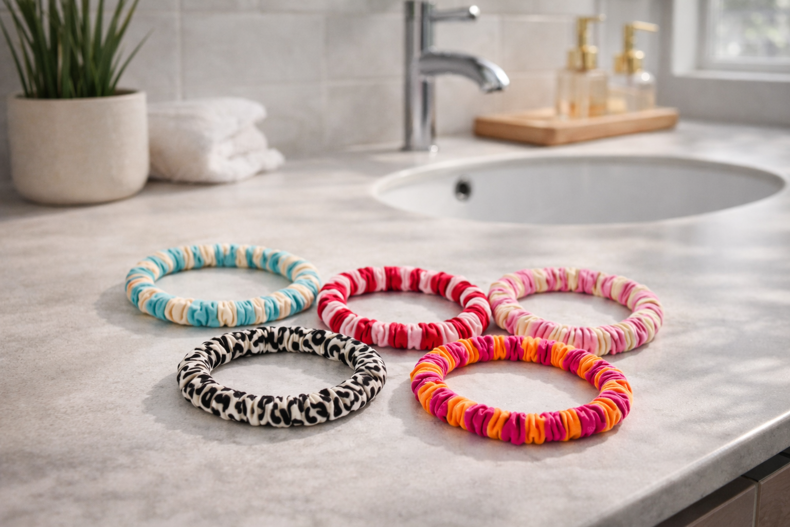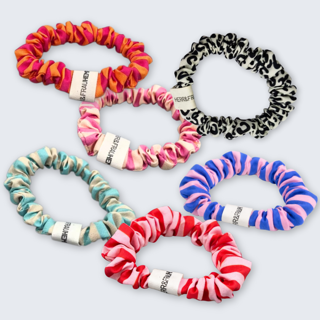 Unsere dünnen Scrunchies sind die kleinen Alltagshelden für dein Haar – leicht, angenehm und immer bereit für eine extra Portion Farbe im Leben.